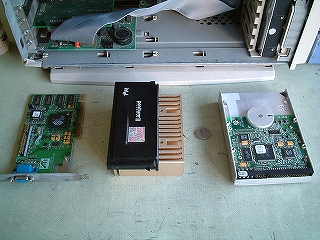 | 左から、取り外した、グラフィックカード、CPU、電池、HDD。 |