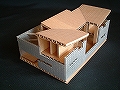 紙倉庫用の頑強な基礎と鉄骨の構造体(躯体)を残し、金属の外装材で包み込み、屋根、壁の必用な部分に開口を設ける。その中に、入れ子状に、木造の部屋を入れ込む。性格の異なる庭とそこに射し込む光が、この住宅のテーマだ。